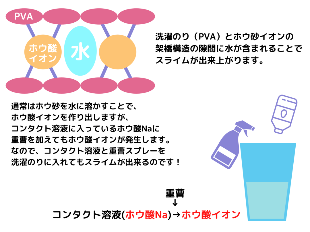 コンタクト洗浄液の中にはホウ酸Naという成分が入っていて、重曹と反応させることで、ホウ酸イオンが遊離してきます。このホウ酸イオンでスライムができるというわけです。