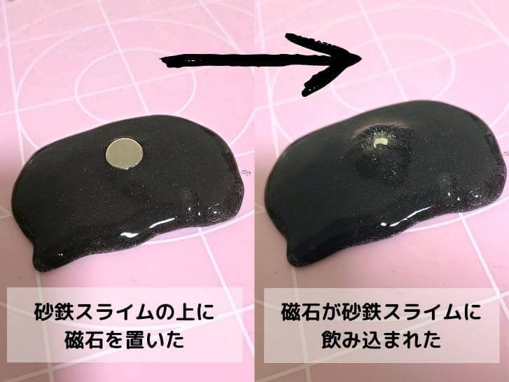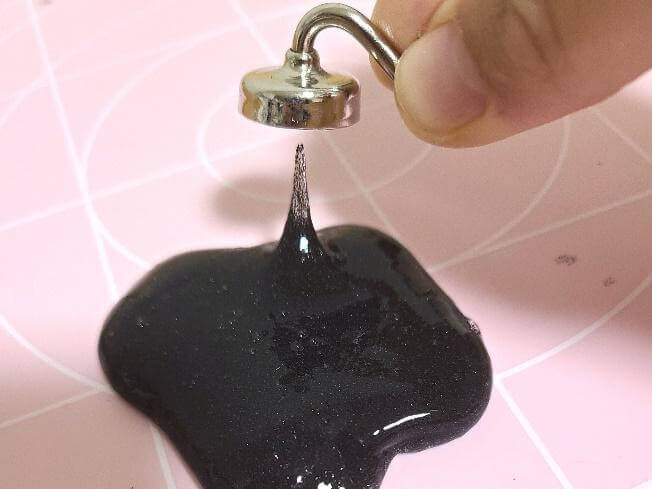 ですから、その砂鉄が混ざったスライムに磁石を近づけると引き寄せられて動くのです。