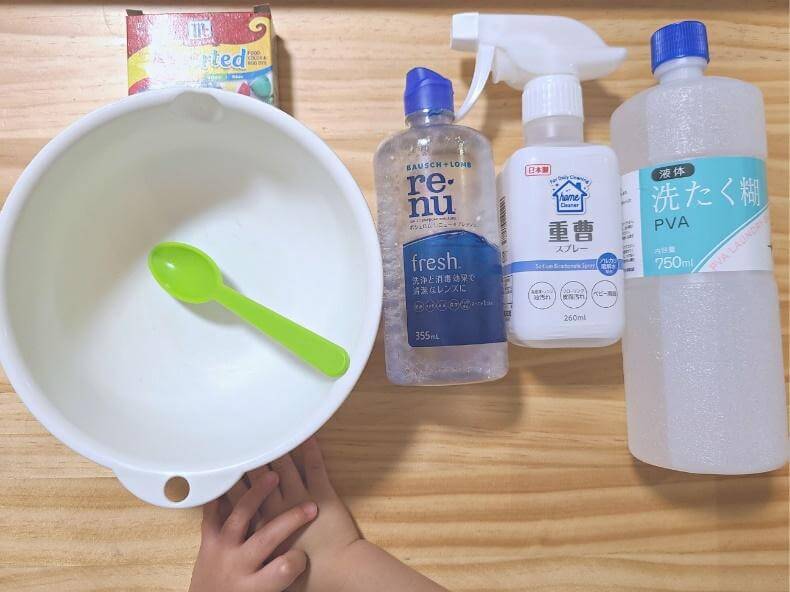スライムを作るには「ホウ砂(ほうさ)」という材料が必要で、ホウ砂は薬局でも売っていますが、もっと簡単に作れる裏ワザがあるんです!
