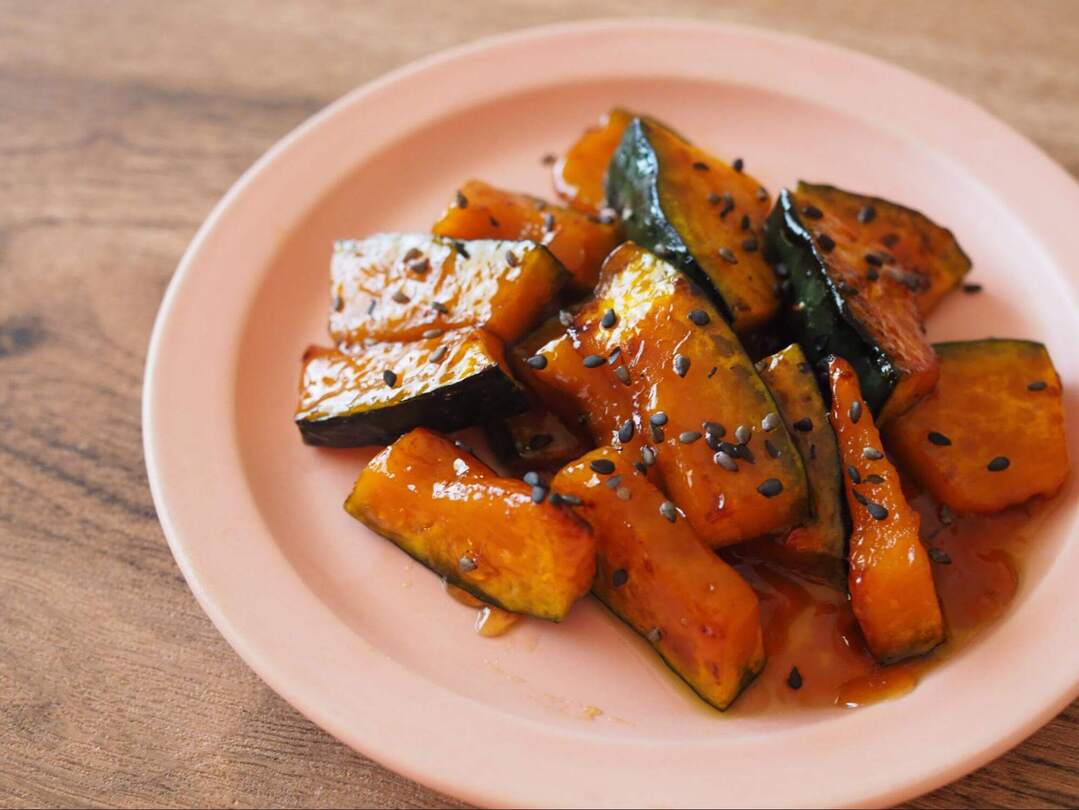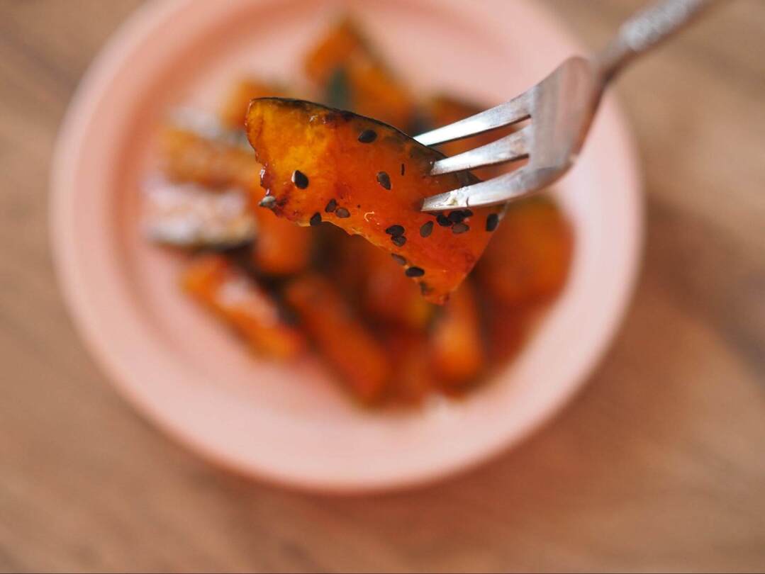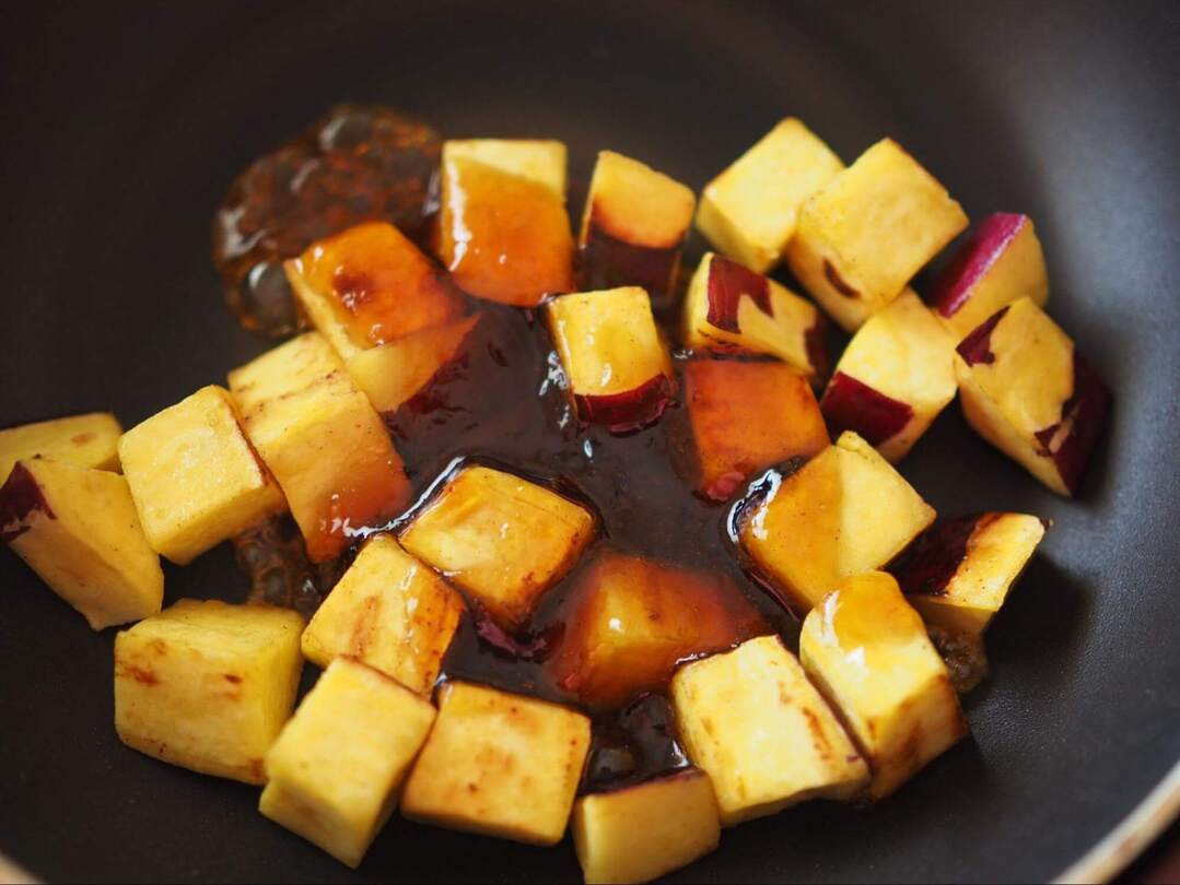 さつま芋と同じく火が通りにくいかぼちゃは、あらかじめレンジで竹串が通るまで加熱してからサラダ油で表面を焼き、たれを絡めました。