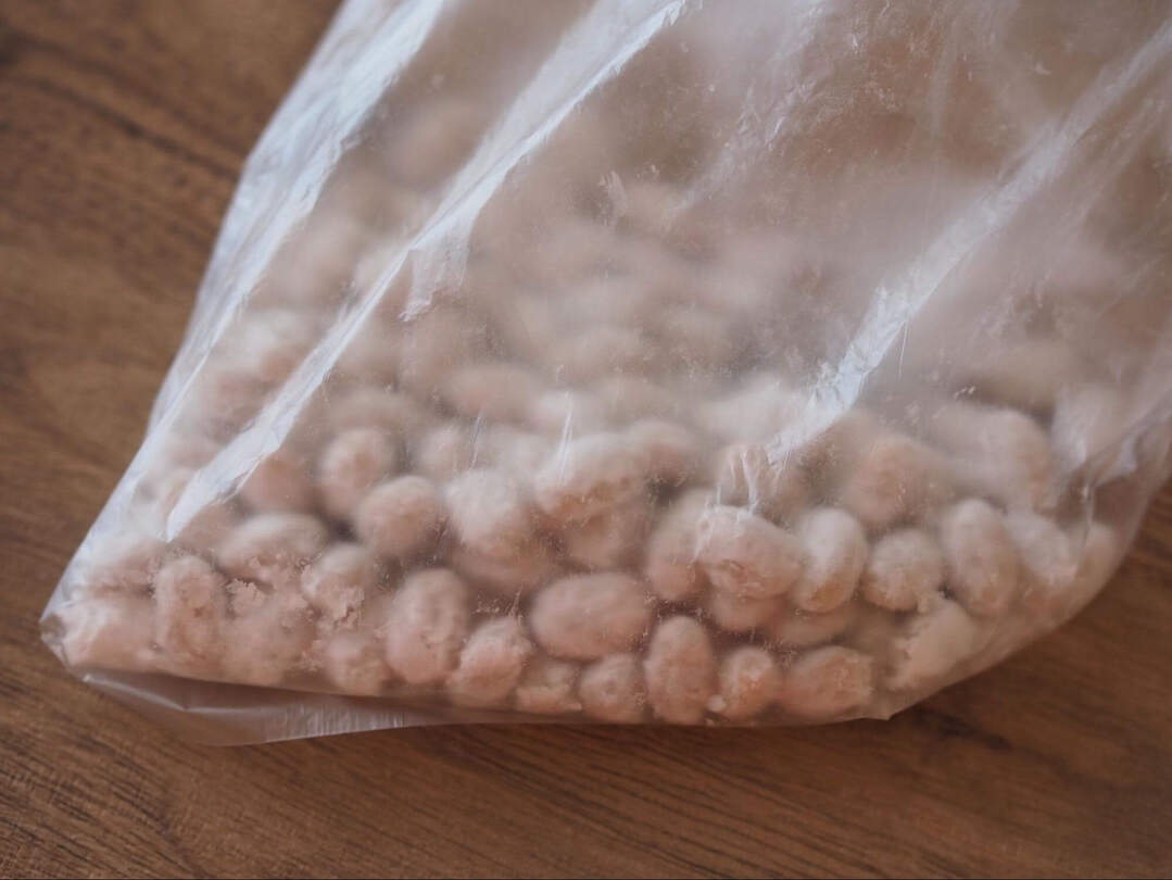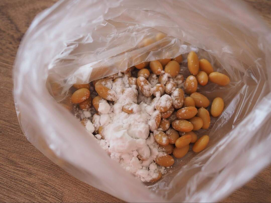 ポリ袋をシャカシャカふって片栗粉を大豆にまぶします。(大豆100gに片栗粉大さじ1程度)