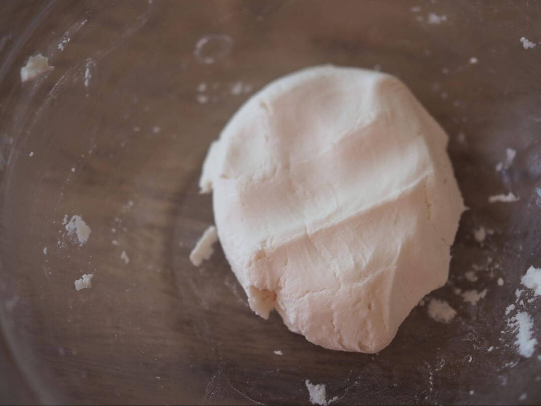白玉粉に水を加え、なめらかになるまで手で練ります。(今回は白玉粉30gに水大さじ2程度〜。白玉粉の種類にもよるので、手で練りながら耳たぶくらいのかたさに調整をしましょう)