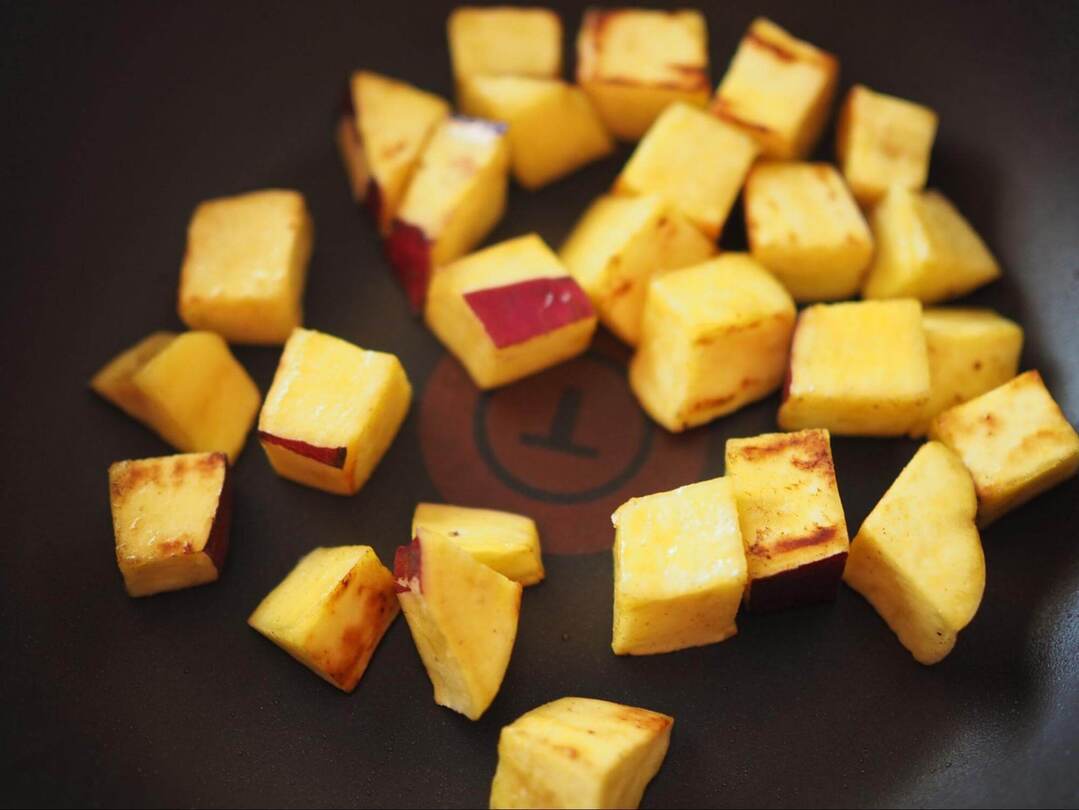 その後、サラダ油少々を入れたフライパンでさつまいもを焼きます。表面がカリッとするまでじっくり焼いたほうが食感があって美味しく仕上がります。
