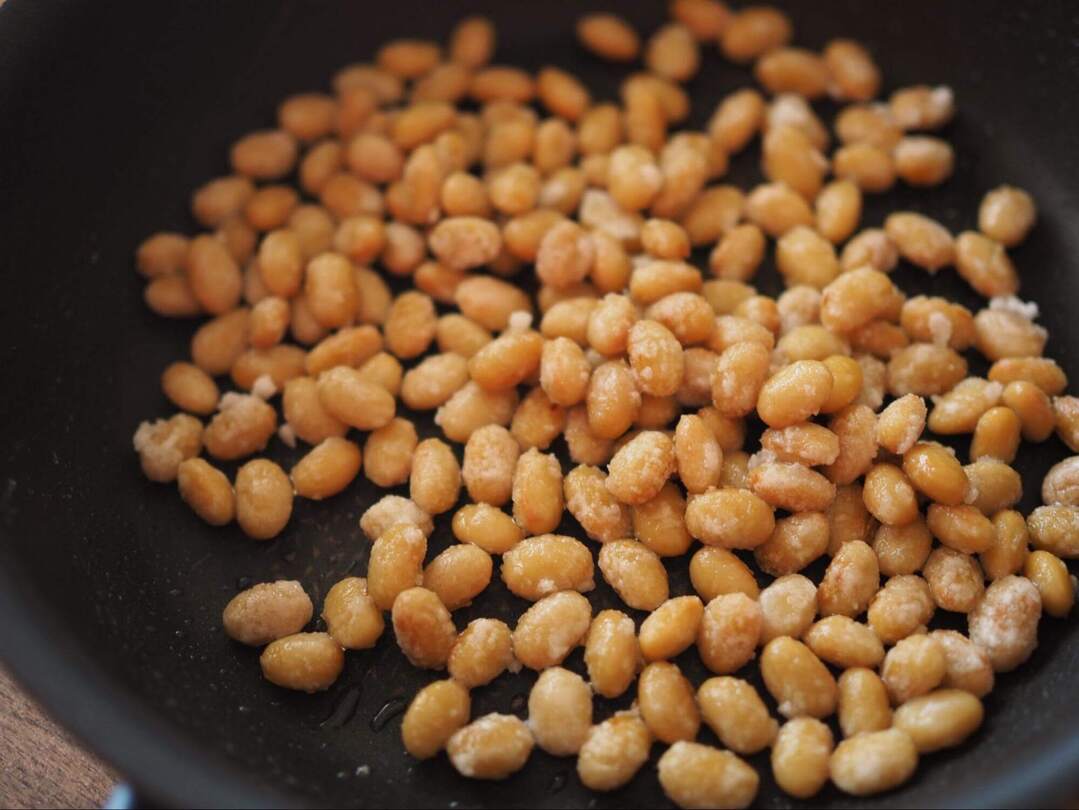 フライパンにサラダ油(大さじ1程度)を入れて大豆をさっと炒めます。片栗粉の粉っぽさが無くなる程度でOK。そこに大学芋のたれを絡めれば完成です。