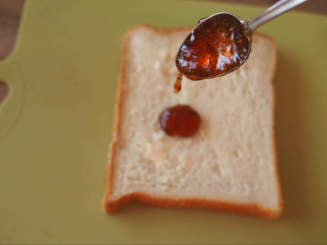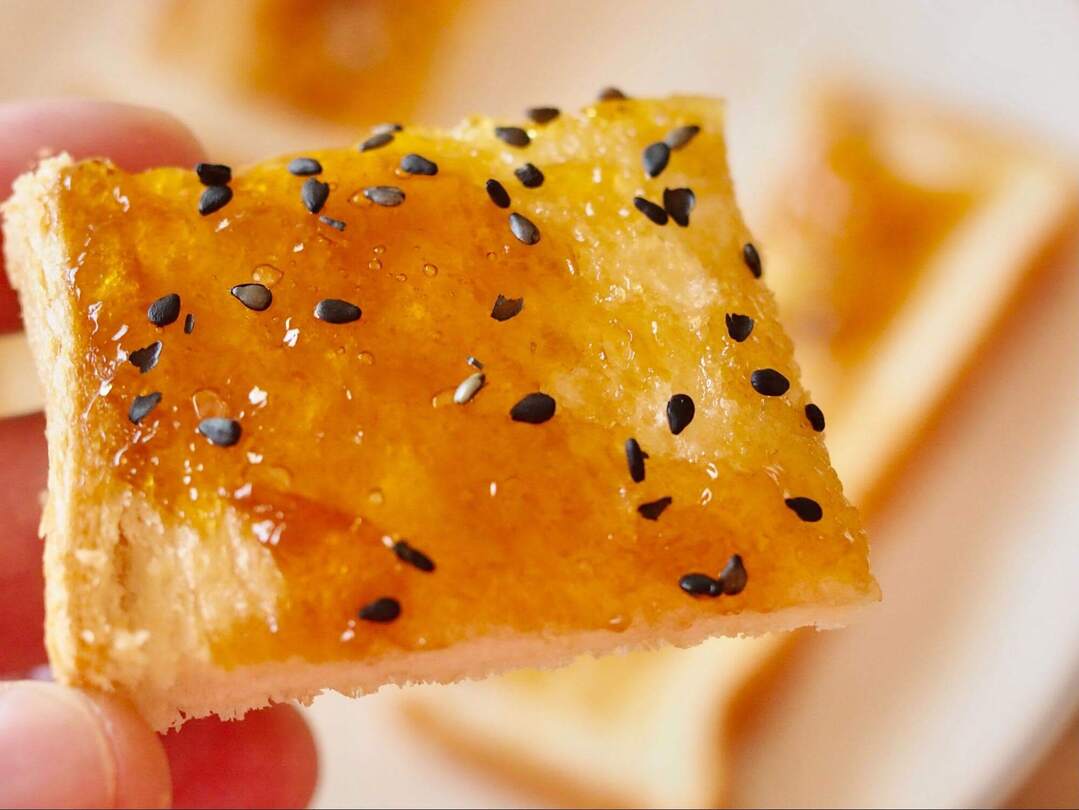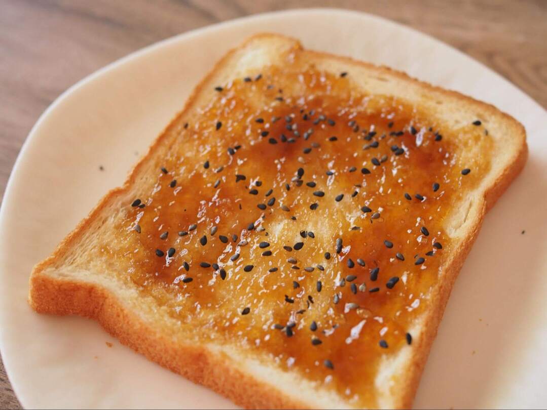 作り方は簡単。食パンにバターと大学芋のたれをぬって、いりごま(黒)をパラパラ。トースターでこんがりするまで焼き上げます。