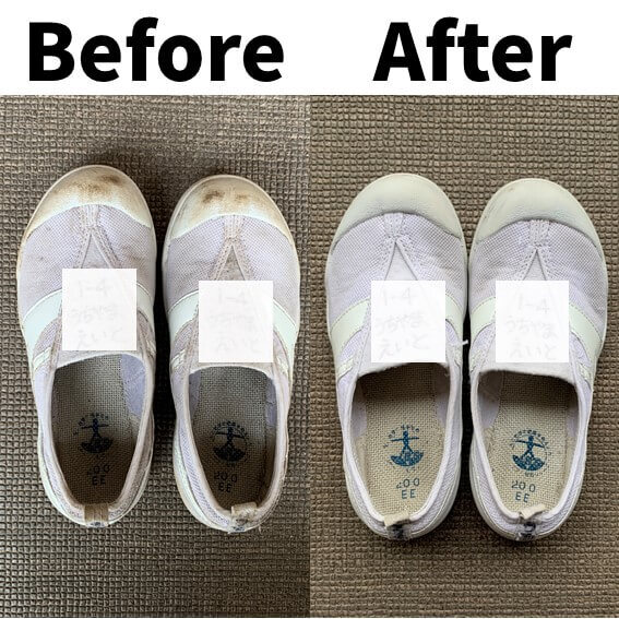 泡が切れきれずに残っていますが、え、なんだか上履きが真っ白に見えるような…!すっごくきれいになっている予感…!!