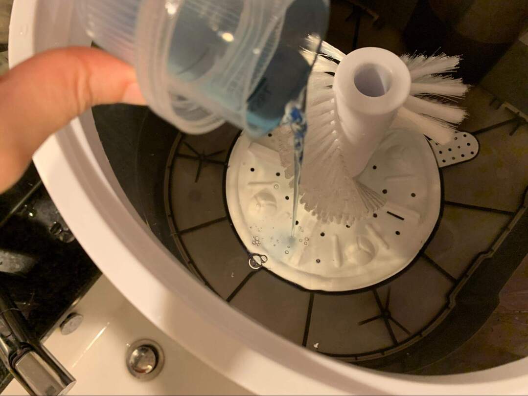 続いて洗剤を入れて溶かします。今回はふだんの洗濯に使っている衣類用の液体洗剤を入れました。
