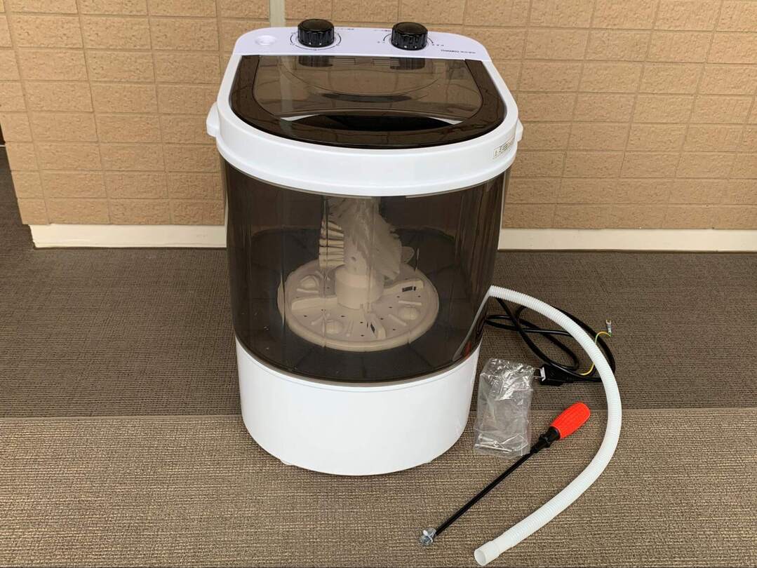 「どこに置こうかな…」と悩みつつ、中身をチェックします。本体のほか、簡易的な給水ホースと、回転ブラシを外して衣類を洗うときのためのドライバーとネジが付属しています。