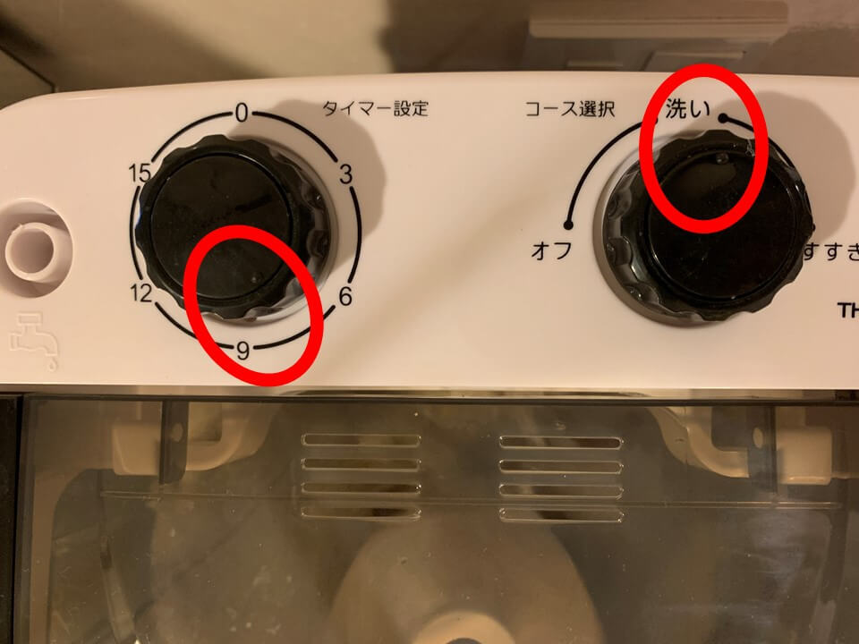 1つはコース選択で「洗い」と「すすぎ」から選びます。残念ながらこの洗濯機には脱水機能はありません。