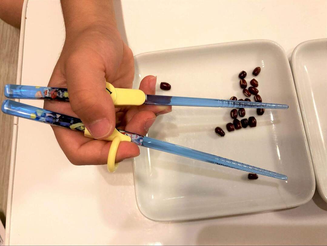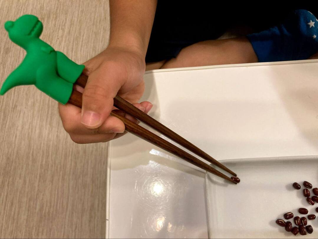 次はいよいよ、箸の持ち方に焦点を当てたトレーニンググッズです。この段階になると、基本的に箸そのものの形をしたグッズになるよう。ふだん使い慣れていない箸ですが、息子は小豆をつかめるのでしょうか…?