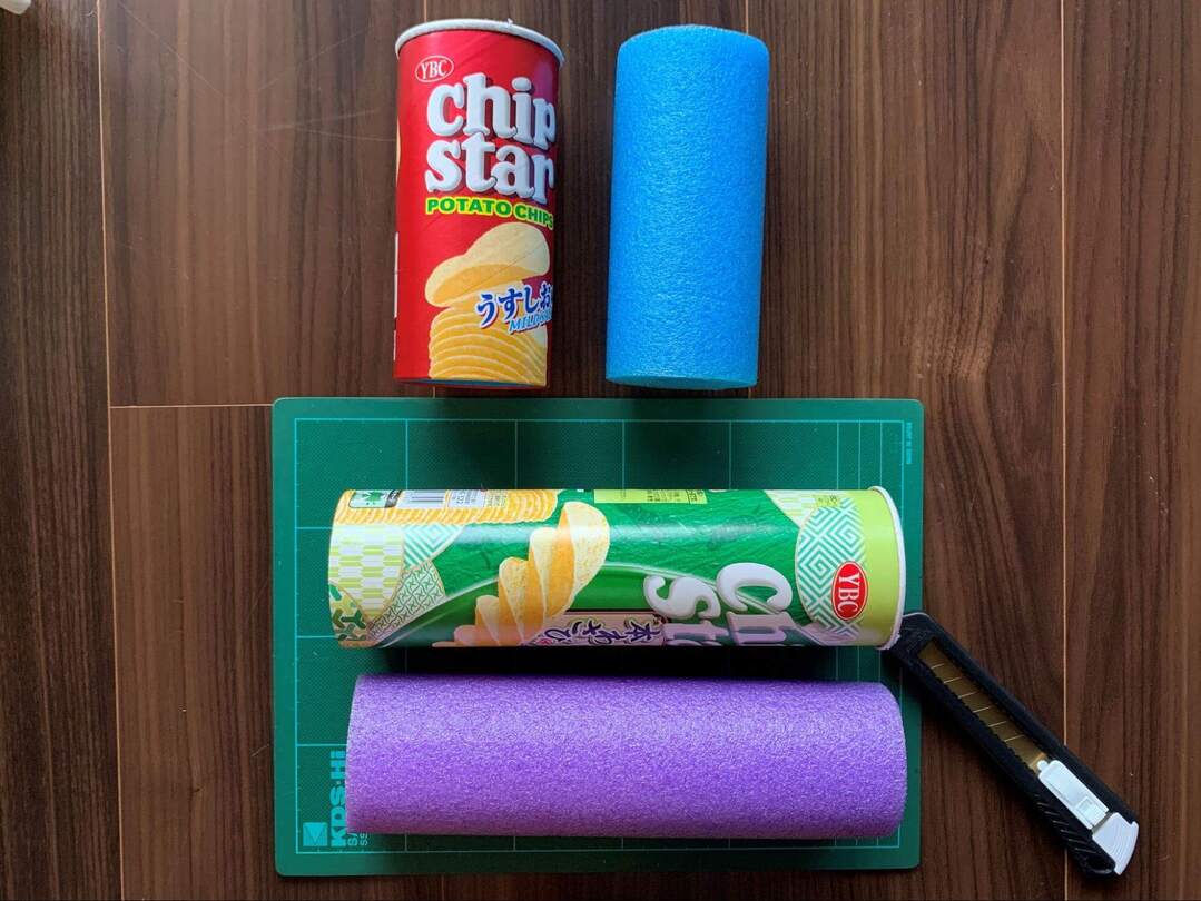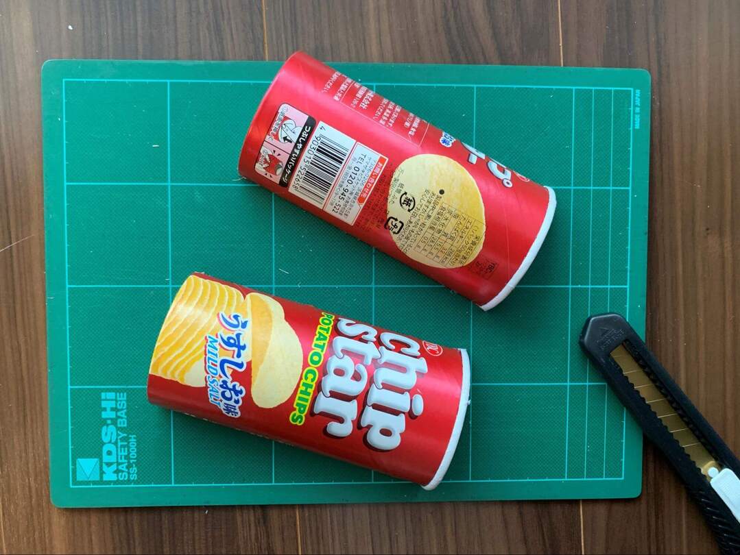 1.チップスターの箱の高さに合わせてプールスティックをカットする