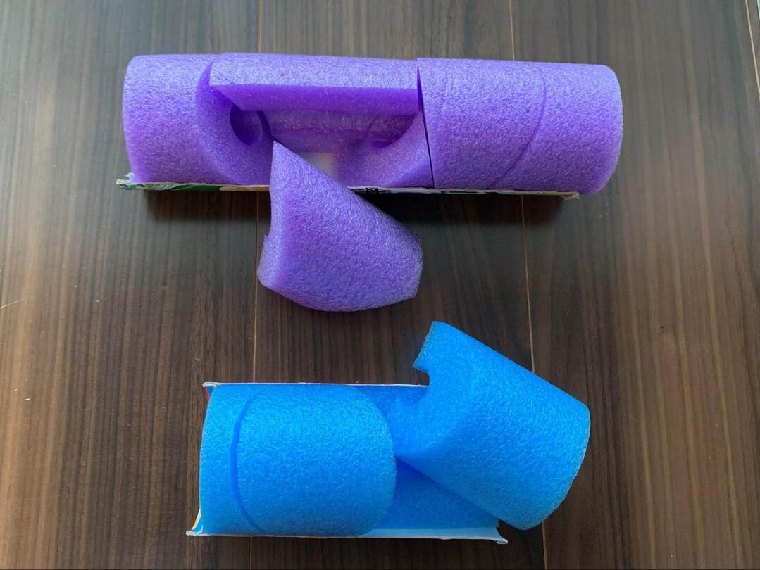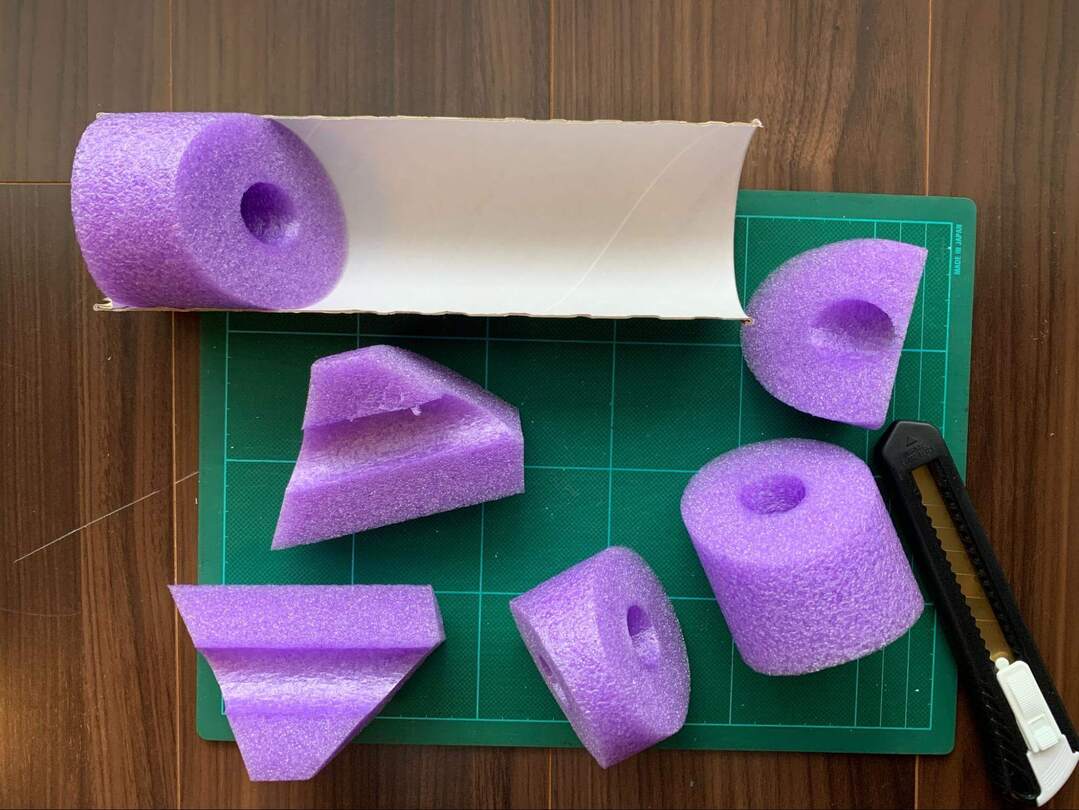 プールスティックはカッターナイフでサクッサクッと切ることができます。今回は、その簡単にカットできることを利用して、立体パズルを作ります。