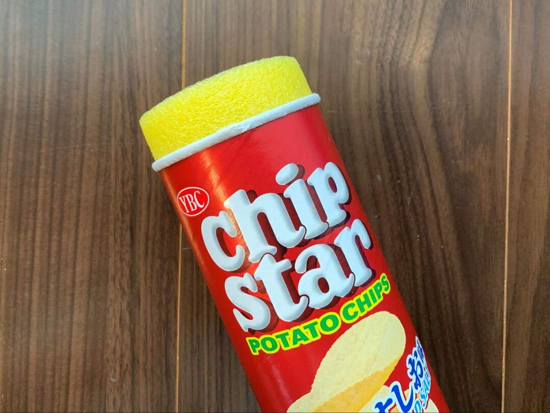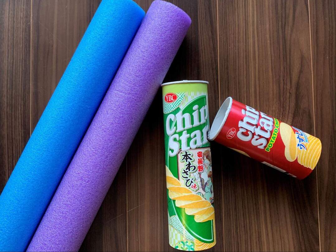 材料はたった2つです。 なぜ、「チップスター」の空き箱指定なのかというと…セリアのプールスティックの直径がシンデレラフィットするから!