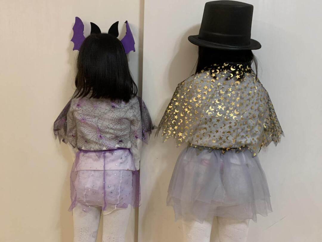 年中と小1の姉妹が装着してみると、マントというよりはケープといった雰囲気。