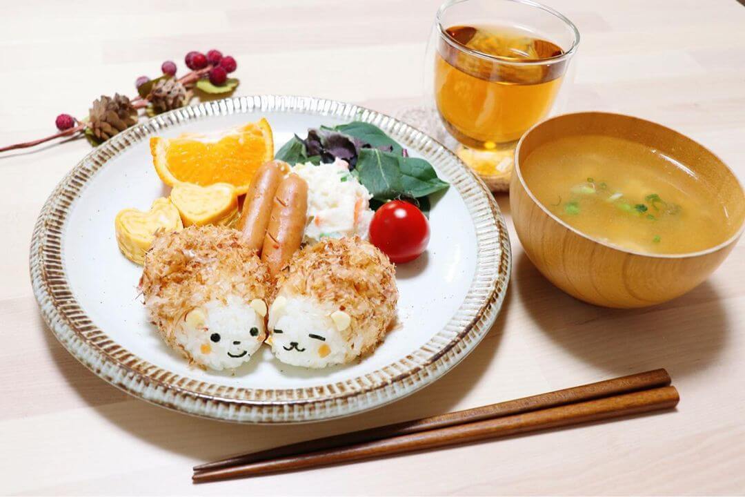 ポテトサラダ、ウインナー、ハート型の卵焼きなど、子どもが大好きなおかずを盛り合わせたワンプレートごはんの主役は、2匹のかわいいハリネズミ!仲良さそうに寄り添うさまがたまりませんね。