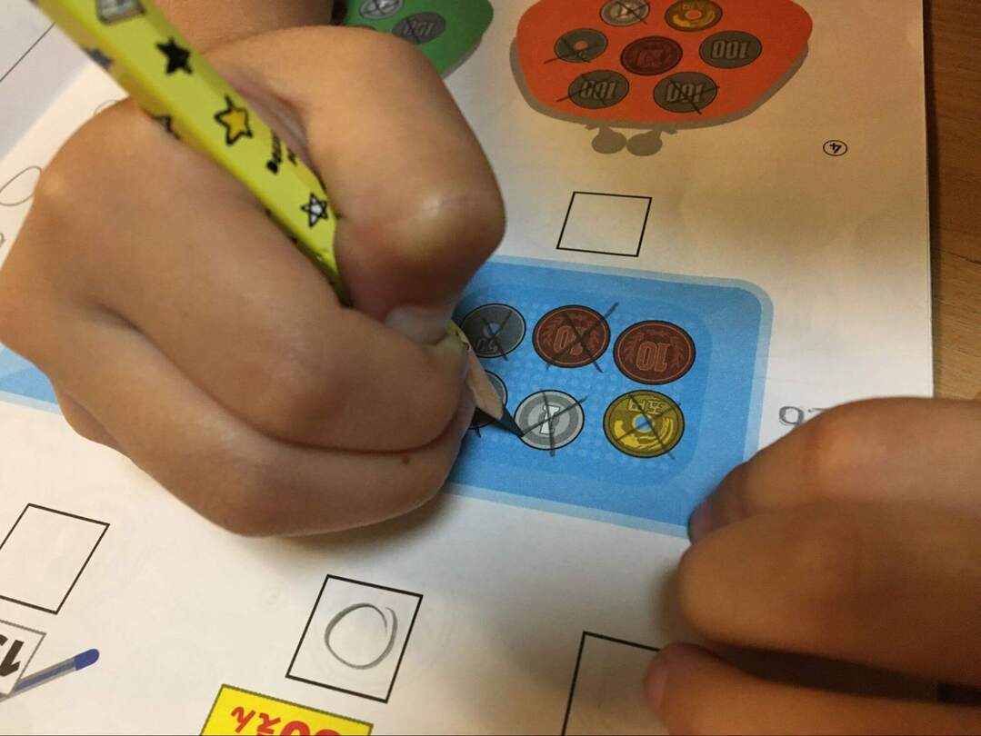 金額の数を書いたり、線でつないだり、カードを並べたり、色を塗ったり。