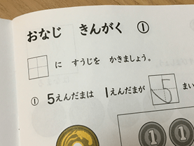 よく考えたらおつかいもさせていないし、園でのお買い物ごっこも「どんぐり」や「ペットボトルのキャップ」を使っているし、実際にお金に触れる機会はなかったかも。そういう意味でもとてもいい教材だと思いました(まだ1ページ目だけど…)。