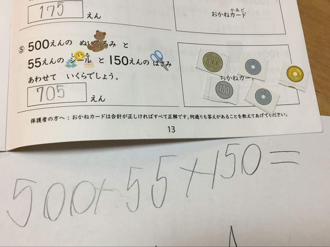 まずはドリルのお買い物ページを使って、買う品を変えながら、「おかねカード」で繰り返し練習するのがいいなと思いました。