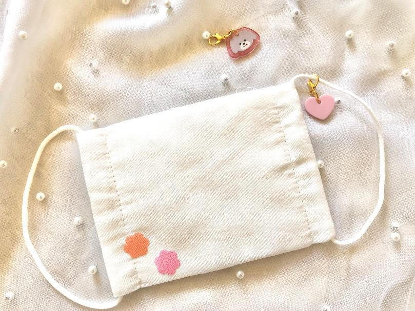 今回は、欲張ってフレークデコレーションクロスとチャームの両方を付けてみました。ただの真っ白いガーゼマスクが一気に華やかにランクアップ!