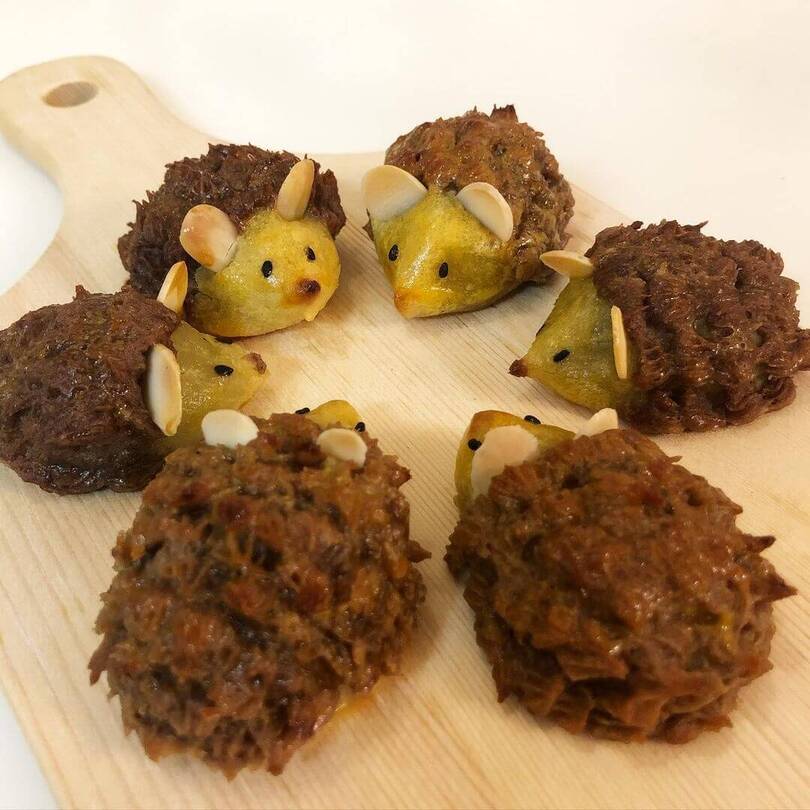 こちらは何やら集まってお話しているかのようなハリネズミたち♡1本のさつまいもが10個のハリネズミスイートポテトに変身。黒ゴマのつぶらな目がなんともかわいいです!