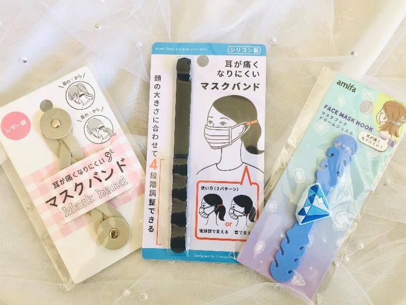 左から「レザー調耳が痛くなりにくいマスクバンド」「シリコン製 耳が痛くなりにくいマスクバンド」「amifaマスクフックドリームジュエム」という商品(いずれも110円・税込)。どれも機能的には同じですが、デザインが異なります。子どもの好みや頭のサイズに合わせて選んでみてくださいね。