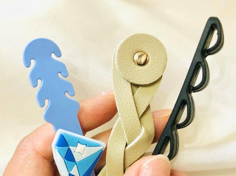 セリアのマスクバンドの装着方法は、どれもフックや溝にマスクのゴム紐を引っ掛けるだけ。画像真ん中のレザー調のマスクバンド以外は、何段階か長さを調節できるので、子どもの頭の大きさに合わせて使うことが可能。どれも柔らかい素材でできており、つけ心地は良さそうです。