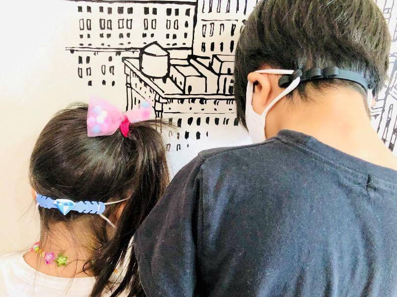 マスクのゴム紐に引っ掛けているだけなので、取り外しも子どもが自分でできました。「マスクバンド」は、耳も痛くなりにくいというだけでなく、マスクがずれにくく、子どもも自分で装着できる、などメリット満載の便利アイテムでした!