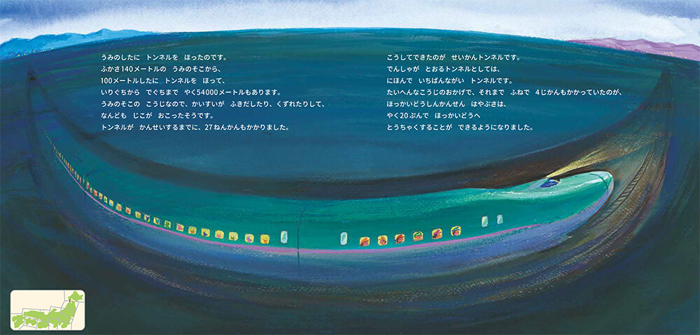 青森と北海道を結ぶ青函トンネルも、見開きでダイナミックに描かれています。