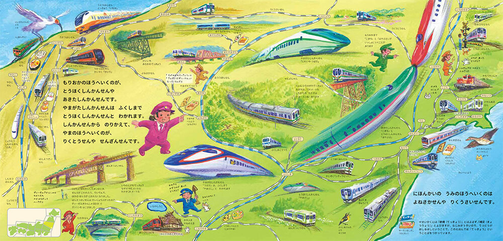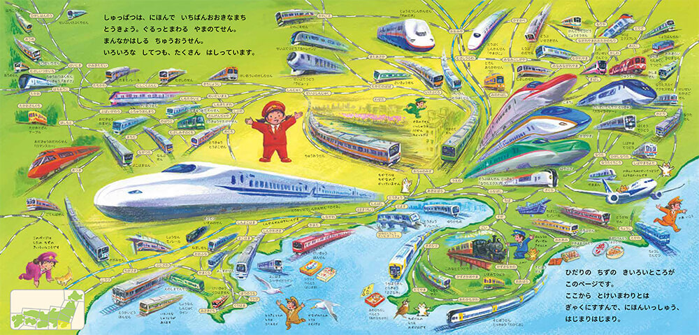 絵本の中で登場している列車は500を超え、新幹線や貨物列車、在来線など、種類を問わずいたるところにたっぷりと描かれています。