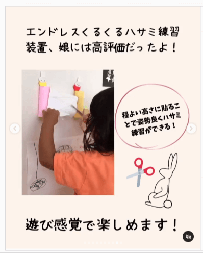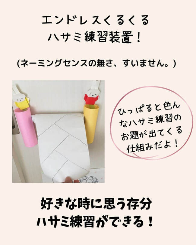 yuyu❇︎さんお手製の「エンドレスくるくるハサミ練習装置」をご紹介しました! トイレットペーパーの芯を装飾するところなどは子どもと一緒にやってもいいですね。