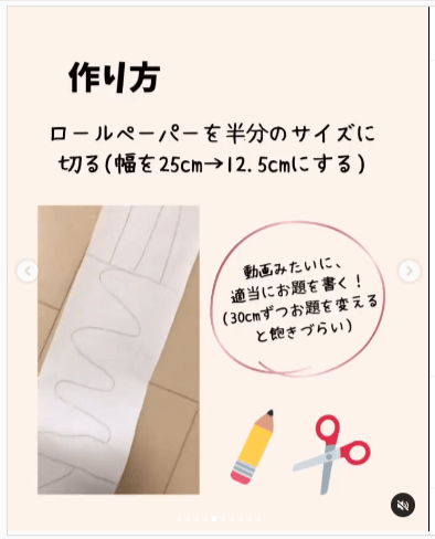 ロールペーパーに書いてあるお題に沿ってハサミで切っていくことで、子どもはハサミの使い方を遊び感覚で無限に練習していくことができます。