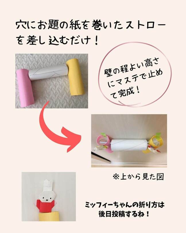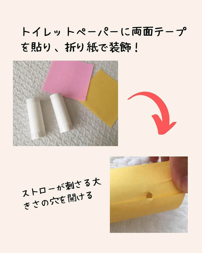 トイレットペーパーの芯はロールペーパーを固定するのに使います。そのままでもよいですが、好きな色の折り紙を両面テープで貼って飾ると、子どもがより楽しめる見た目に!