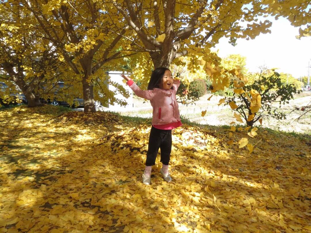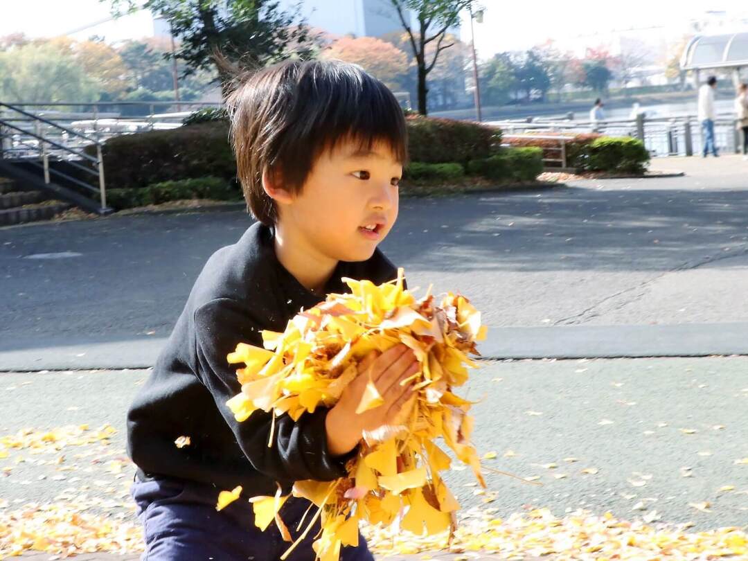 視覚はもちろん、サクサクっと音を感じながら足で落ち葉を踏みしめたり、落ち葉の山をすくって空に投げて舞わせてみたり、大きな落ち葉をちぎってお面を作ったり、銀杏の匂いをかいだり...!子どもといると落ち葉遊びは無限に広がりますね。