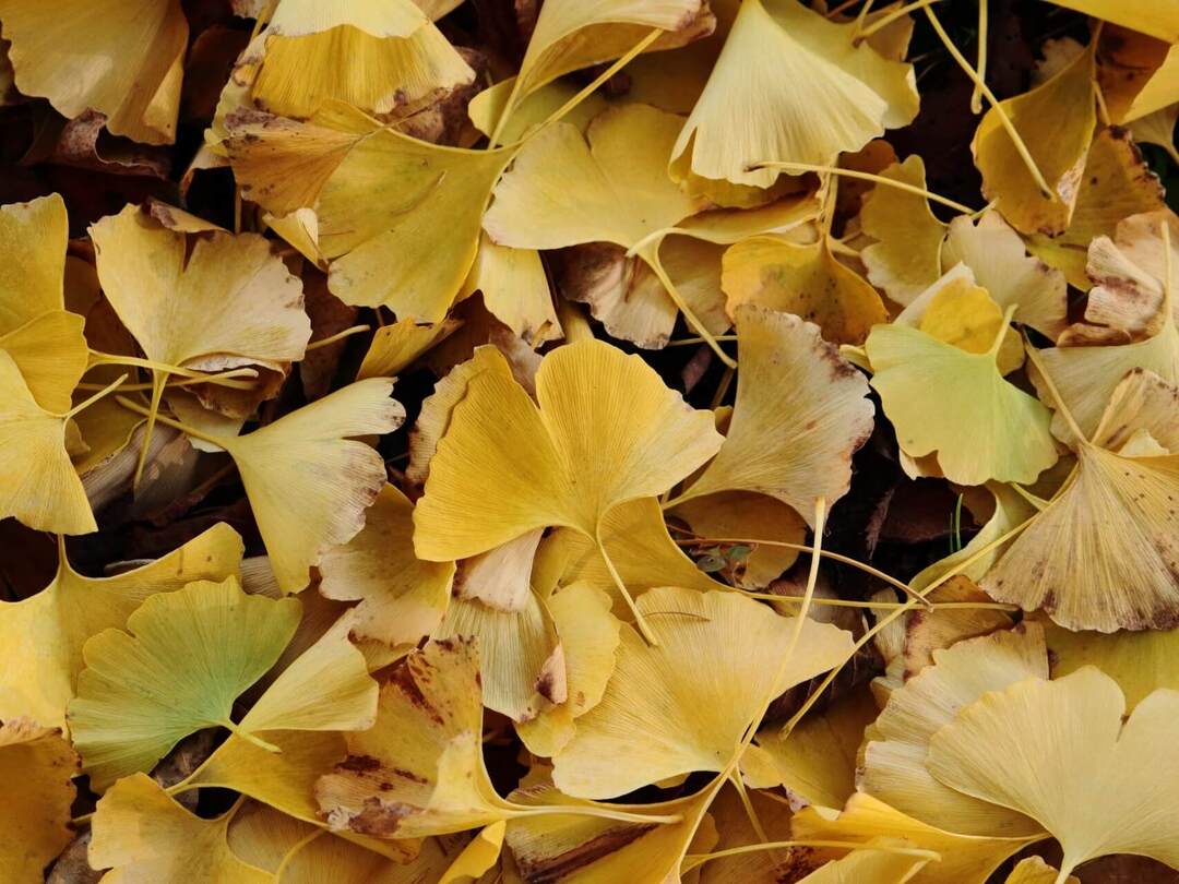 葉の種類によって、もつ色素は異なります。モミジのように緑~黄~赤と変化する葉もあれば、イチョウのように緑~黄と変化して散る葉もありますね。イチョウが黄色になるのは、モミジと同じく、葉緑素が消えて黄色(カロチノイド)が目立つことによる変化です。イチョウは赤(アントシアン)が作られないので、赤くならずに散ります。また、茶色くなる葉は茶色の色素(フロバフェン)が作られることにより色が変化します。