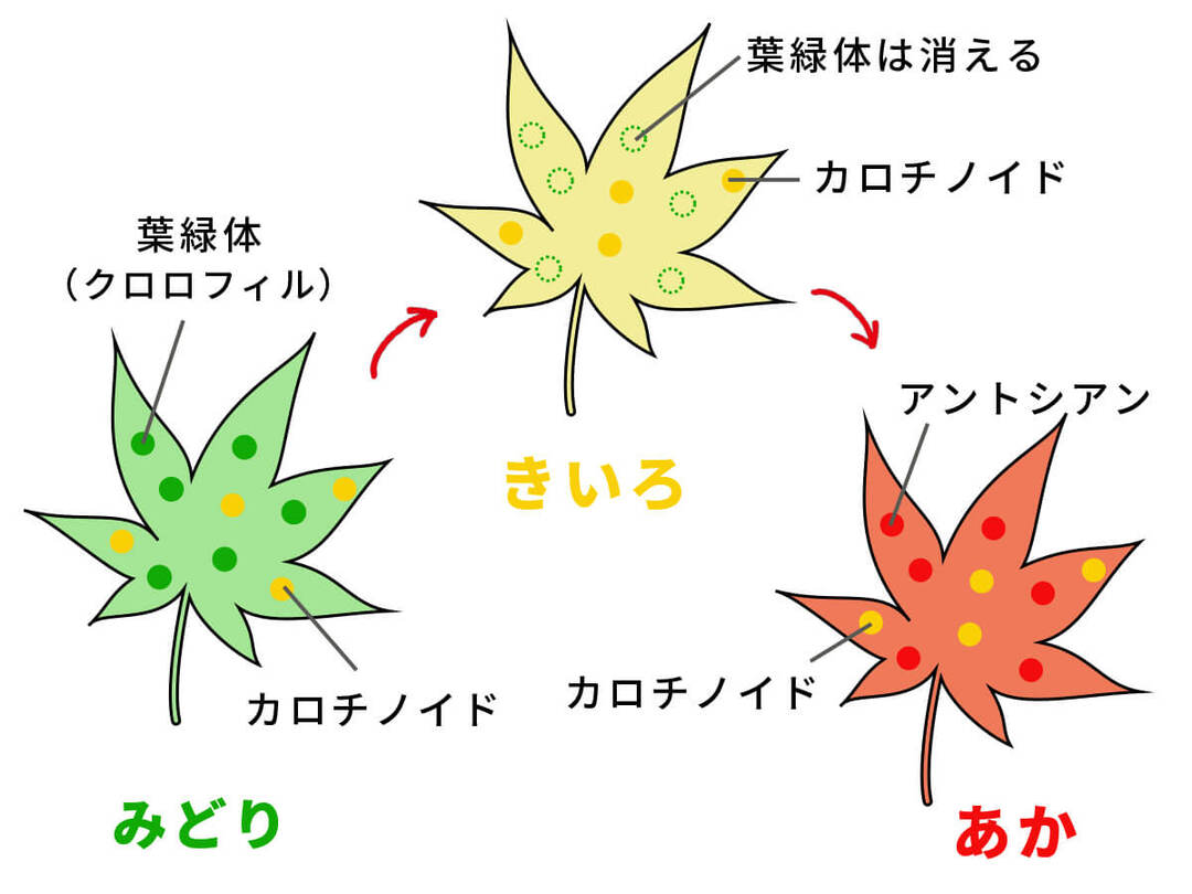 緑から黄、赤と色を変えていくモミジの葉の色の変化を例に説明します。
