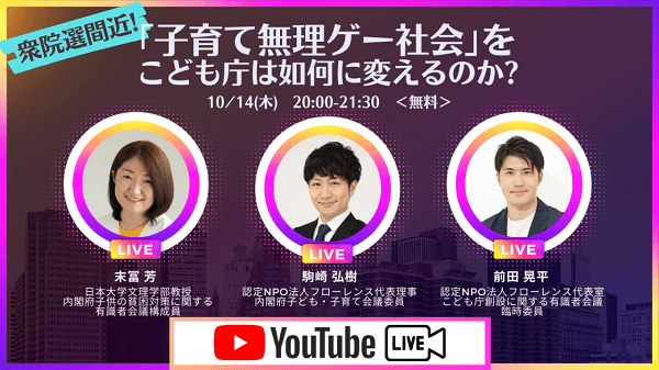 去る2021年10月14日、政府の有識者会議の委員も務め、子育ての当事者でもある3人の有識者によって、「衆院選間近!”子育て無理ゲー社会”をこども庁は如何に変えるのか」と題しYoutubeLIVEが開かれ、これからの子育て制作に関しての熱い議論がくり広げられました。