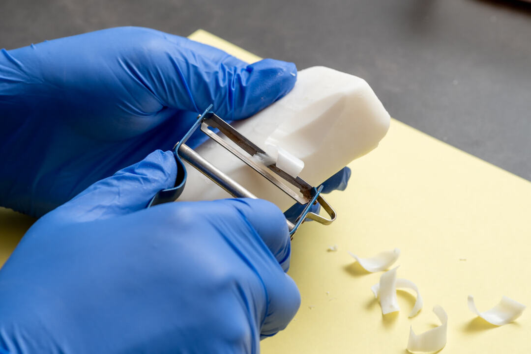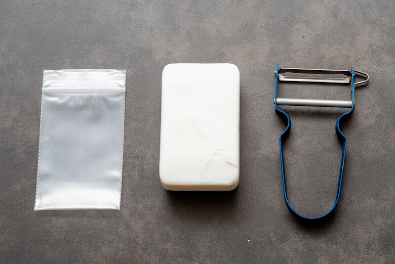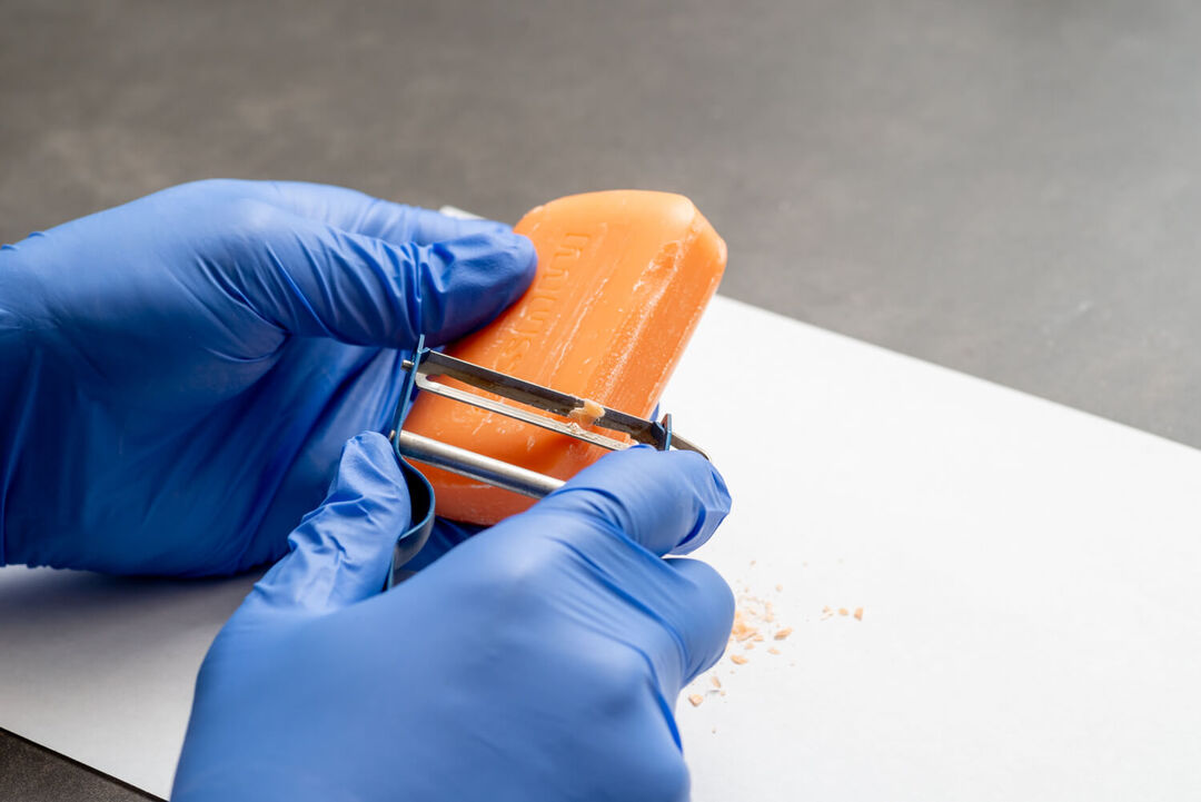 石鹸の角の部分からピーラーで2、3cm削り取っていきます。